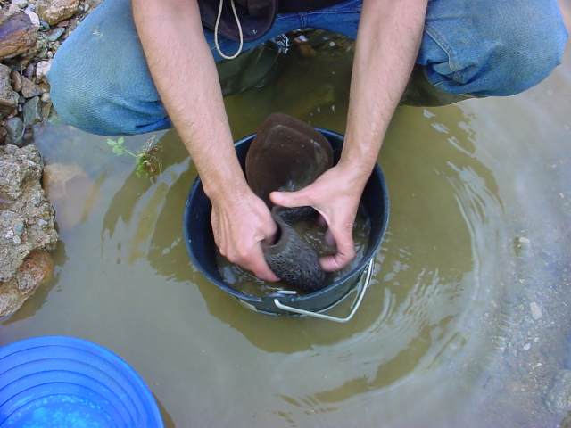 Pour les moquettes classiques et paillassons de sablières, il faut les sécher, les pendre et les taper pour en faire sortir les lourds mais il reste toujours quelques points qui en font une véritable toison d'or et un excellent gadget pour faire des animations et initiations au bateyage. Sèche, roulée et mise droite dans un seau à vendanges, on tape dessus à coup de démonte pneu et il en tombe toujours au fond du seau de nombreux points d'or et sables noirs dans un nuage de poussière argileuse, parfait pour faire une batée d'initiation ou de démonstration...